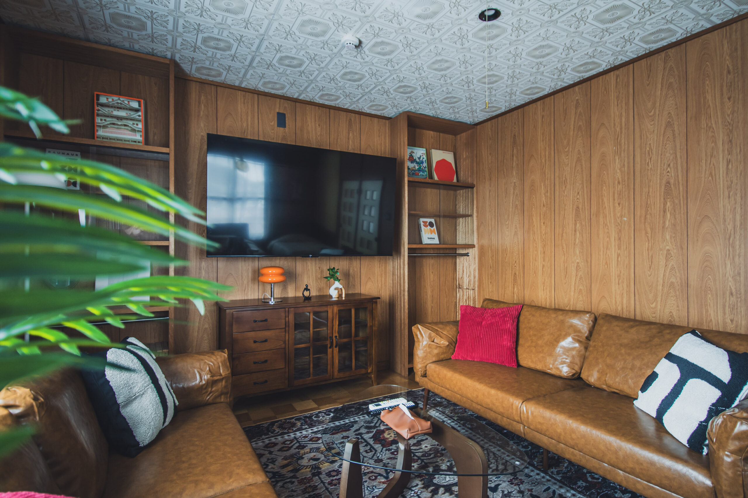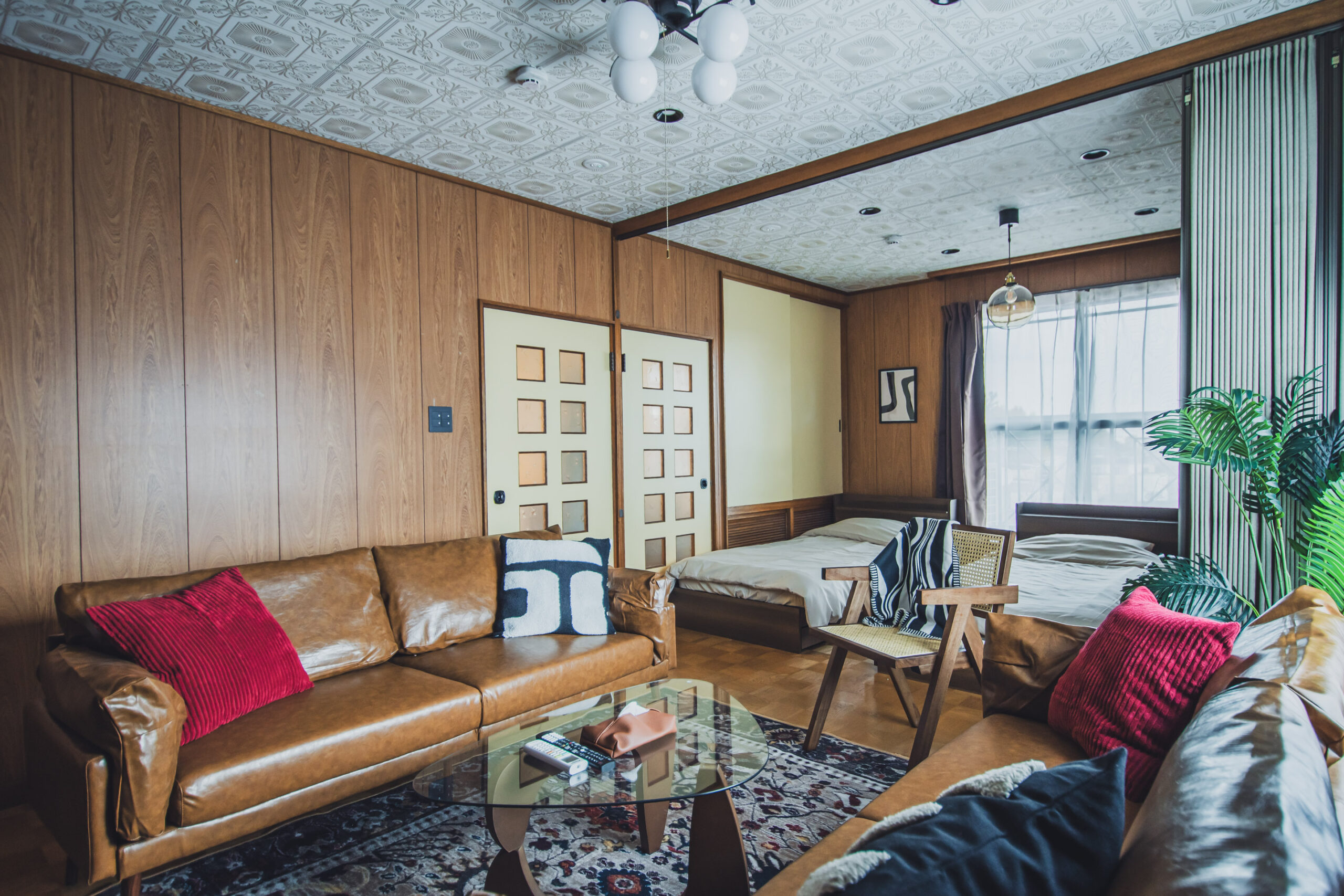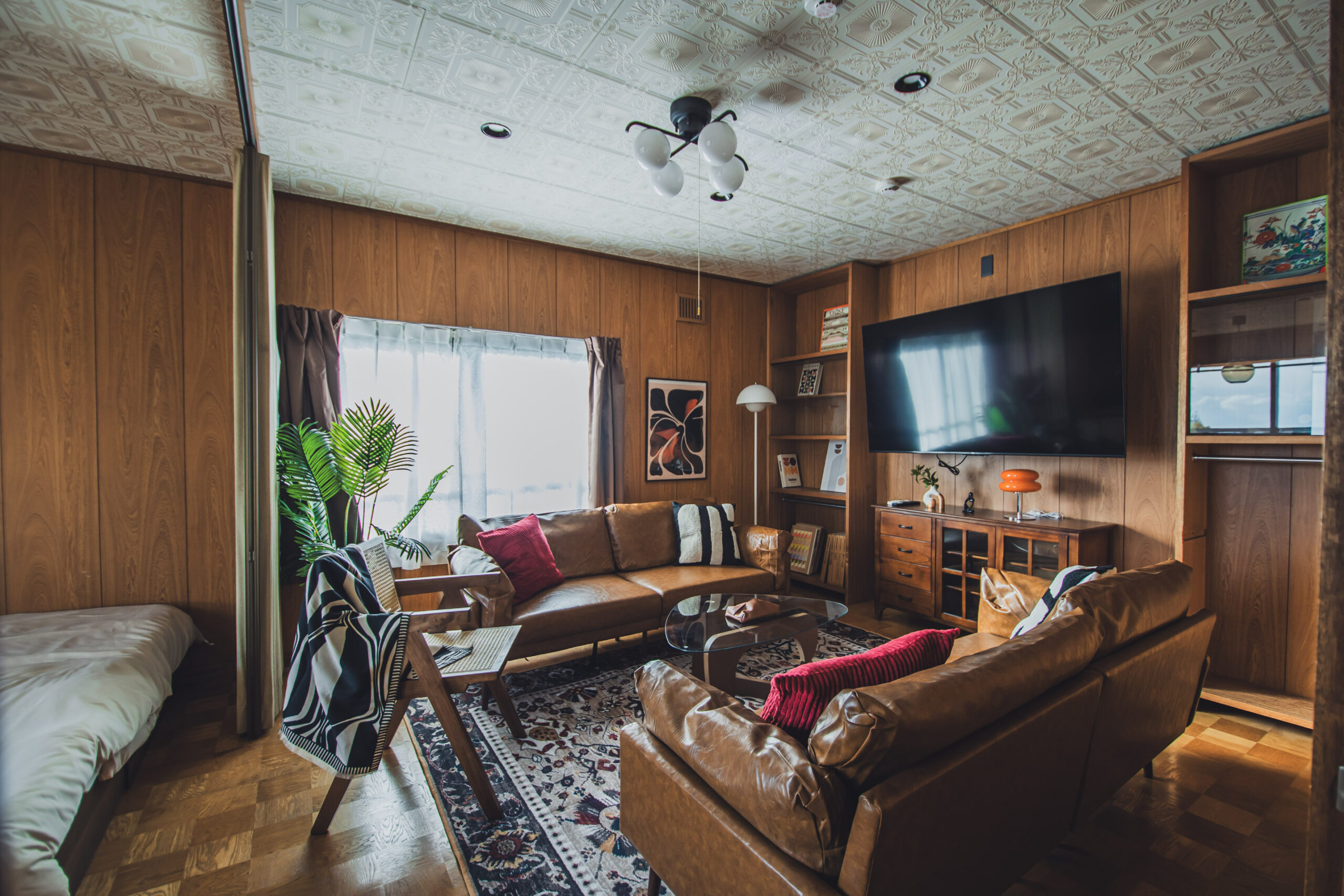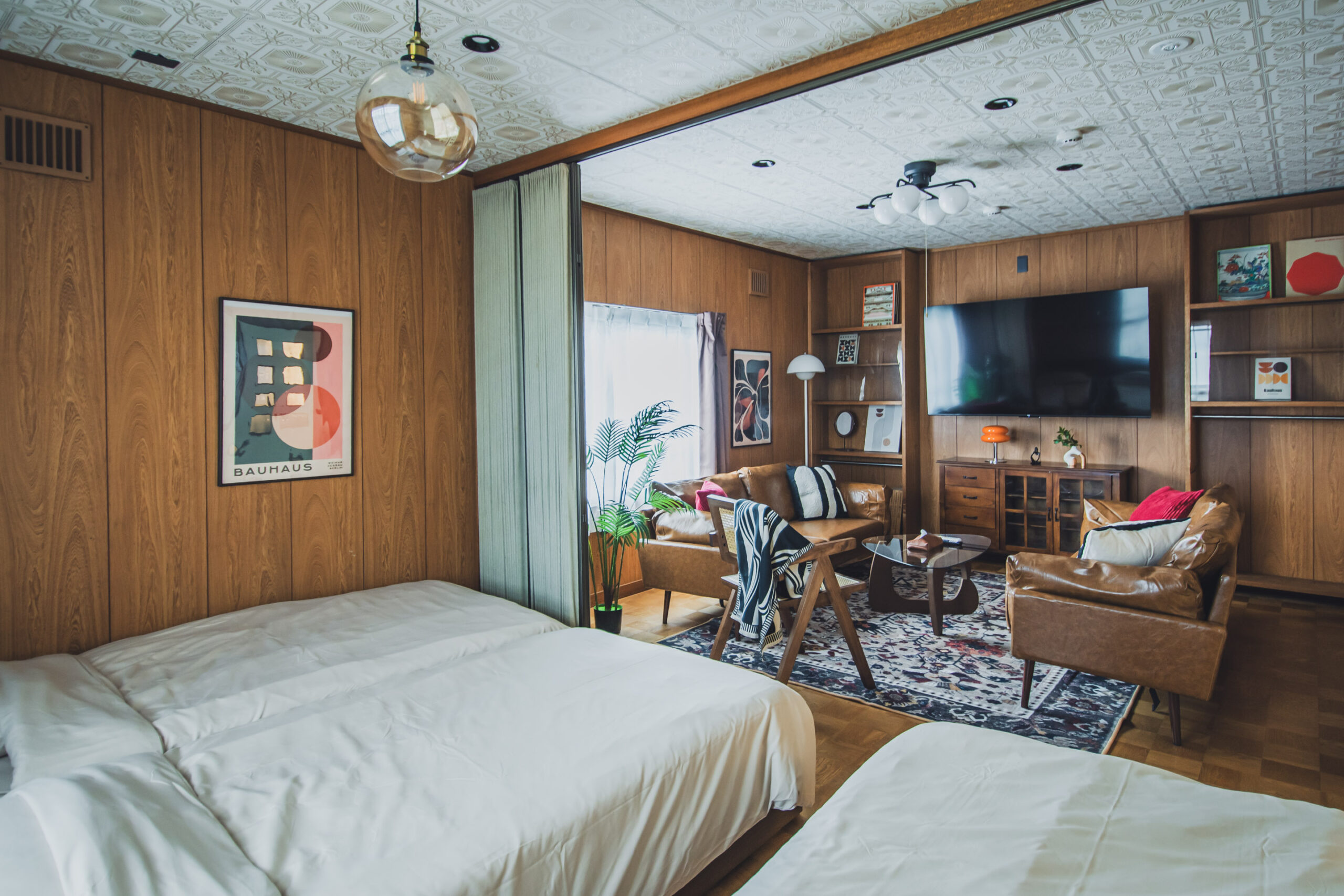 ミッドセンチュリーの家具や照明を調和させた空間。